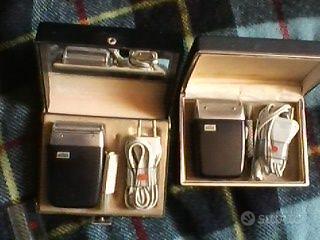 DUE Rasoi elettrici BRAUN anni '60 collezionismo VINTAGE-MODERNARIATO di design. Due rasoi elettrici FUNZIONANTI marca BRAUN, dei primi anni '60 Designer: Gerd A. Muller. modello "Braun Sixtant SM3 Super" (con selettore per voltaggio 220 o 110 ) prime versioni, ancora col cavo (originale) e lo spazzolino in colore bianco, e corpo rasoio in nero e acciaio satinato. completi di contenitore a cofanetto rigido e corredo: spazzolino di pulizia, cavo elettrico amovibile, bloccacavo per il ricovero. FUNZIONANTI. Condizione USATI. Interno cofanetto vellutato, con qualche zona di scurimento per uso e tempo. a) è il rasoio più antico. Il motore sembra girare un po' a rilento. Cofanetto con chiusura a molla e scatto, misure: 16 x 11 x 4 b) è di poco successivo, versione con specchio incorporato nel coperchio interno del cofanetto, che ha una chiusura frenata e fibbia a bottone di chiusura. La lamina traforata ha un piccolo buco ovale di 2 mm. ca. Il coperchietto in plastica trasparente (protettivo della lamina e testina) manca di una parte del bordo esterno inferiore, ma è perfettamente agganciabile. Misure Cofanetto: 15 x 11,5 x 5 Entrambi perfetti nel corpo del rasoio, con parti intercambiabili tra i due. Peso del cofanetto completo ca. 750 gr cad. cad. eur 68 tratt. Sconto per la coppia. Sconti per acquisti multipli e/o anche su altri miei annunci. Visione e consegna gratuita in Torino.
