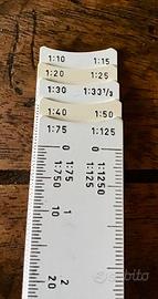 Due scalimetri anni ‘70 con righelli multipli ciascuno portante sul bordo una differente scala metrica per la lettura diretta delle lunghezze su disegni, piantine, mappe. Ideali per architetti, geometri, tecnici, costruttori ecc.