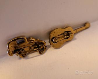 Due spille vintage con brillantini raffiguranti un'auto e una chitarra, di piccole dimensioni, offerte al prezzo eccezionale di 7 euro l'una