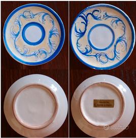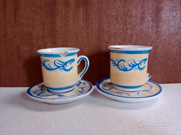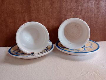 Due Tazzine da Caffè con rispettivi piattini, "Vintage" Maioliche dipinte a mano per Collezionisti Mai usate ma in condizioni come da foto a causa del tempo. Le dimensioni sono: Altezza di entrambe le tazzine: Tazzina con il manico: 5,9 cm Tazzina senza manico: 6 cm Il diametro del bordo superiore di ogni tazzina è 5,8 cm Il diametro di ciascun piattino è 9,3 cm