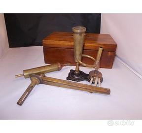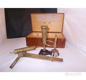 EBULLIOMETRO tipo MALLIGAND con valigetta in legno "VINTAGE" - USATO - Un oggetto da collezione imperdibile L'EBULLIOMETRO è uno strumento di misura del grado alcolometrico, serve a determinare approsimativamente la quantità alcoolica dei vini e di tutti i liquidi alcoolici. Esso si basa sul diverso punto di ebollizione che diminuisce con l'aumento della ricchezza alcoolica. Strumento in uso negli anni 1920/1930 circa EBULLIOMETRO in valigetta di legno comprese istruzioni quasi illeggibili... L'EBULLIOMETRO è costituito da : - Fonte di calore : caminetto con stoppini "usati" - Termometro : braccio con termometro e scala graduata "Adonnino 4982" - Caldaia : serbatoio conico - caldaietta - Tubo condensatore - - Valigetta in legno con chiusura e maniglia per trasporto Gli elementi in rame e ottone sono lievemente ossidati ma in buone condizioni estetiche. Lo strumento appare poco o nulla utilizzato. Strumento per misurare il grado, alcool, vino,..... Dimensione valigetta : Kg2x32x19x12 cm circa