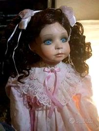 Bambola d'Artista Americana numerata dietro al collo in Porcellana Biscuit completa di accessori (ha anche un fiore), piedistallo in legno (a cui manca la parte superiore in metallo facilmente reperibile altrove in qualunque negozio fai-da-te), talloncino, Certificato di Autenticità, firma dell'Artista e Scatola Originale. La bambola ha una piccola e leggera rottura sul viso davvero poco percettibile e indossa un grazioso completino in cotone finemente ricamato, scarpe in vernice fatte davvero tanto bene. Non è mai stata esposta.
