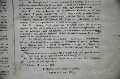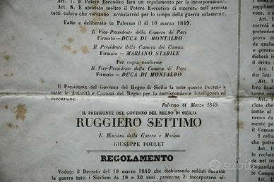EDITTO SICILIA 1848 (titolo:SICILIANI!) – Governo del Regno di Sicilia. Editto originale stampato all’epoca su manifesto ed emanato ed affisso a Palermo l’8 settembre 1848, con il quale deliberò un Ordinamento Militare per dislocare le forze militari in Sicilia. Incorniciato su vetro. Misura cm. 45x65. 300€ Nota: il documento è libero da vincoli dei Patrimoni Culturali.