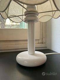 La lampada è in condizioni eccellenti per la sua età ed è ben descritta nelle foto: perfettamente funzionante; paralume pari al nuovo, senza strappi, buchi o macchie; base in metallo laccato bianco senza rotture o mancanze di vernice; componenti elettrici originali d'epoca.