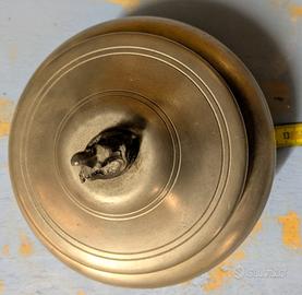 Raffinato contenitore con coperchio in peltro brunito, ideale come bonbonnière, porta gioie o elemento decorativo per una tavola ricercata. L'oggetto si distingue per una linea pulita e bombata, impreziosita da dettagli classici che richiamano l'artigianato della metà del secolo scorso.