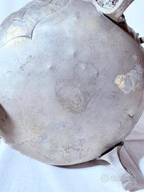 vendo antico calderone in peltro punzonato, caratterizzato da una struttura bombata con decori floreali a rilievo e preziosi manici a voluta. Il calderone poggia su quattro piedini lavorati e presenta una splendida finitura satinata dal sapore autentico. Un pezzo d'arredo di grande classe, ideale per valorizzare piante da interno o come elemento decorativo in ambienti dallo stile classico o shabby chic. Disponibile la spedizione o ritiro di persona. Dimensioni: altezza 35 cm x diametro 24 cm
