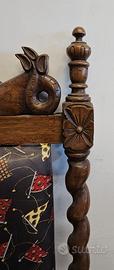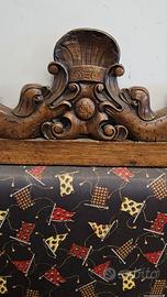 Schienale imponente con cimasa intagliata a motivi floreali e araldici, recante uno stemma nobiliare con iniziali (vedi foto dettagliata).