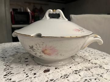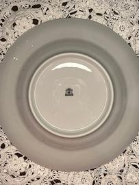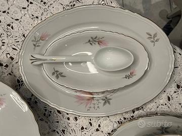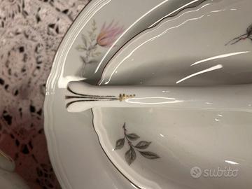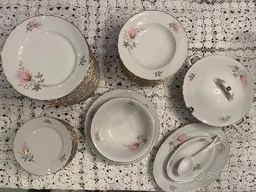 Elegante servizio di piatti in porcellana tedesca Durken, originale anni ’60, in ottime condizioni. Questo set si distingue per un raffinato decoro floreale nei toni del rosa e del grigio, con eleganti bordi lobati rifiniti in oro zecchino, tipico dello stile Mid-Century di alta qualità. Il servizio è straordinariamente completo, perfetto per grandi occasioni e tavolate numerose. Il pezzo forte è la maestosa zuppiera accompagnata dal suo raro mestolo originale in porcellana, un dettaglio difficile da trovare integro oggi. Il servizio è completo per 12 persone ed è composto da: •24 piatti piani •12 piatti fondi •12 piatti da dessert •1 zuppiera con coperchio e cucchiaio •1 insalatiera •2 piatti da portata tondi •2 piatti da portata ovali •1 piattino ovale piccolo da portata Caratteristiche: •porcellana bianca con decorazioni floreali delicate •bordi rifiniti in oro •stile classico ed elegante Condizioni: Il servizio è stato conservato con estrema cura e appare in condizioni eccellenti per la sua età. La porcellana è integra. L'oro zecchino sui bordi è quasi perfetto e brilla vividamente, con solo lievi e normali segni di usura del tempo in pochissimi punti, come mostrato nelle foto di dettaglio. Perfetto per amanti del vintage o per chi cerca un servizio elegante da tavola. Per ulteriori foto o informazioni non esitate a contattarmi. 📍 Consegna a mano preferita in zona Cuneo e dintorni/ spedizione da concordare (la cifra presente è indicativa. Per questioni di sicurezza data la fragilità dell'articolo, l'ordine si dividerebbe in due pacchi).