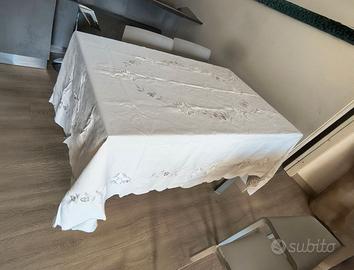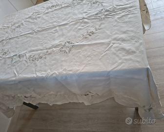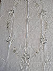 Elegante set composto da una tovaglia e dodici tovaglioli, realizzati in lino antico. - Dettagli ricamati floreali. - Bordo rifinito con lavorazione. - Set coordinato per la tavola. - Nuovi mai usati - misure cm 240x165 la tovaglia i tovaglioli misurano centimetri 38x38 - antico corredo realizzato da ricamatrici siciliane con applicazione a uncinetto e dettagli ricamati a mano Set elegante composto da una tovaglia e dodici tovaglioli, perfetti per occasioni speciali o per aggiungere un tocco di classe alla tavola. - Tovaglia con raffinati ricami floreali. - Dodici tovaglioli coordinati.