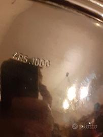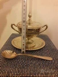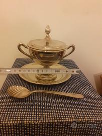 Elegante Zuccherieriera con piattino e cucchiaino. Erano un regalo di nozze di jia suocera quindi hanno più di 50 anni. Oggetto vintage molto elegante. Solla scatola come visibile nelle foto c'è scritto "M. Argen. 1000" mentre sulla Zuccherieriera c'è inciso "Arg. 1000". Non so se è un oggetto d'argento o solo ricoperto d'argento non me ne intendo. Lo vendo come oggetto bello e antico da esporre ed usare in quanto io non l'ho mai utilizzato, è sempre stato nella sua scatola originale chiuso in un mobile e dopo tanti anni è ancora bello lucente.