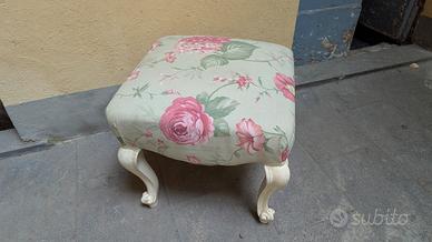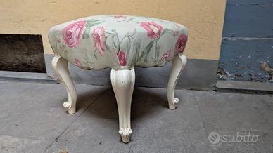 Elegante sgabello in stile barocchetto, realizzato negli anni 1940. La struttura è ispirata al modello Chippendale, con gambe mosse e proporzioni armoniose. Sono stati ritappezzati con cura e laccati in tonalità chiare, che ne esaltano la linea decorativa. stile classico o shabby chic.
