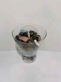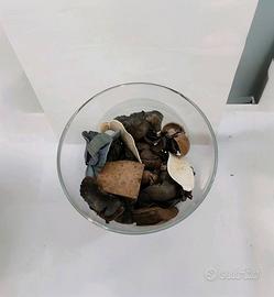 Elegante vaso in vetro trasparente, con potpourri decorativo. Design moderno e raffinato.