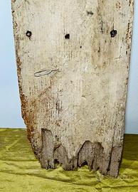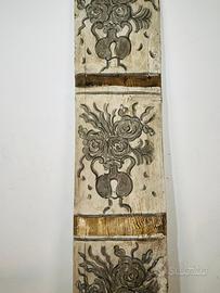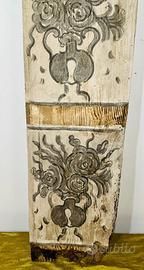 Questo elemento in legno decorativo proviene da un vecchio soffitto siciliano del XIX secolo. È composto da tre pannelli verticali, ognuno decorato con motivi floreali con vaso, davvero raffinati. La pittura a tempera su gesso, applicata su tavole di legno, mostra chiaramente i segni del tempo, come crepe e scolorimenti, che raccontano la sua lunga storia e aggiungono un fascino unico e autentico all’insieme. Puoi usufruire del pagamento protetto e sicuro con spedizione tracciata, completa di numero di tracciabilità. E se dovesse succedere che il tuo acquisto si perda, o viene danneggiato, si è coperti per spese di acquisto e spedizione! Per qualsiasi domanda, o chiarimento, fammi sapere!