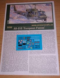 Elicottero kit 'Mister Craft Hobby Kits - AB-212 con decals per realizzo 3 versioni Italiane: "Italian Army - "Marina Militare Italiana - "Aeronautica Italiana e inoltre altre 4 versioni Straniere: "Austrian Army - "Spanish Army - "Hellenic Army - "German Army ( Scala 1/72 )