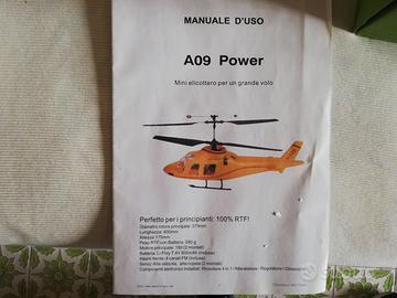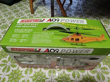 Vendo elicottero A09 Power della Sabattini,4 canali. Completo di telecomando, alcune eliche rotte e 4 eliche nuove. Non dispongo invece della batteria che quindi non è inclusa nella vendita. Includo un alimentatore da testare.
