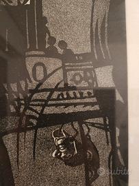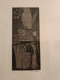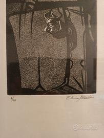 Manini Elio, "Fiction", tiratura limitata di 10 esemplari, acquaforte/acquatinta. Elio Manini, nato a Bentivoglio (BO), 22/02/1937. Pittore e incisore, in un primo momento si forma frequentando il laboratorio di M. Leoni, successivamente si perfeziona seguendo i corsi d’incisione presso l’Accademia di Belle Arti di Bologna. Pratica l’incisione dal 1972 producendo fino ad oggi oltre 130 matrici, realizzate principalmente ad acquaforte, acquatinta, ceramolle e xilografia. Le sue opere in genere rappresentano temi ecologici e composizioni surreali.