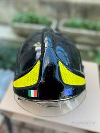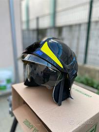 Elmetto - casco vigili del fuoco vintage. Le doppi visiere di protezione sono funzionanti ed in sede. Manca la parte in plastica dell’attacco laterale destro e il gancio di fissaggio del sottogola.