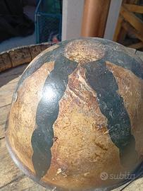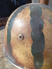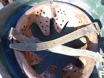 Elmetto italiano ww2 Tg 59. Rivetti bellici 2 tipo a scalino , cuffia con cuciture parallele timbrata AT 39 e soggolo grigioverde con reggisoggolo rettangolari . Vedi foto, colore mimetico postbellico .