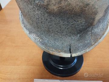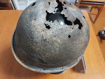 Elmetto M1 utilizzato dalle forse U.S.A nella seconda guerra mondiale dal 1942 in sostituzione del modello Brodie. Calotta esterna in acciaio e casco interna chiamata "liner" per regolazione taglia. Elemetto recuperato in Francia nel paese di Bayeux in Normandia Si notano ancora parti di colorazione naturale.Il casco porta i segni della battaglia ed è danneggiato sulla parte superiore ma è solido.