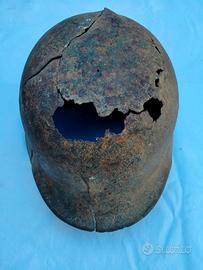 Vendo un elmetto militare in acciaio, probabilmente un modello tedesco (Stahlhelm M35/M40/M42), risalente al periodo delle Grandi Guerre. Questo oggetto non è un pezzo da collezione in perfette condizioni, ma una vera e propria reliquia storica. L'elmetto è in condizioni molto scarse a causa di un'avanzata corrosione. Presenta una grande rottura sulla sommità (fori causati da schegge o proiettili, chiaramente visibili in foto).