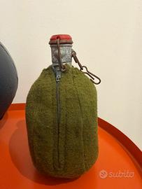 Insieme all'elmetto, borraccia militare d'epoca, in alluminio e rivestita in panno verde.