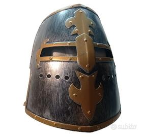 Elmetto da cavaliere in stile medievale, ideale per travestimenti o collezionismo. Presenta finiture dorate e un design robusto.