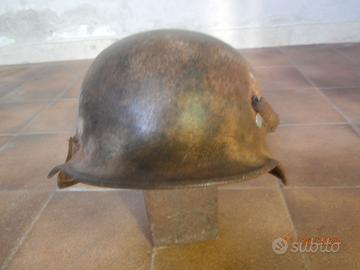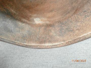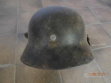 elmetto tedesco 1942 recuperato in fienile, n.ro serie 885 leggibile all'interno, con danni esterni e la presenza di saldatura dove nel dopo guerra in campagna Italiana veniva utilizzato nelle stalle per recuperare liquame (pison).