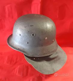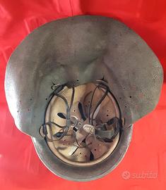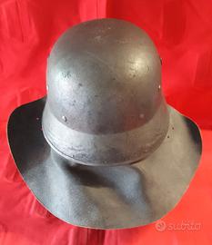Vendo elmetto tedesco modello M36 da pompiere vigile del fuoco, anni '50, originale, dietro all'interno è stampato numero "2", con interno originale, in resina e bordino in alluminio e cuoio, condizioni buone come da foto, misura lungo davanti alla visiera al cuoio dietro 36 cm, larghezza da destra a sinistra del cuoio 38 cm, misura del cuoio che scende dietro 9 cm, all'interno dove entra la testa 17 x 20,5 cm. Peso 1 kg.