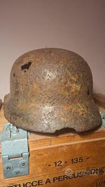 elmetto waffen ss in condizioni da scavo lo dallo stemma si può ancora intravedere il fantasma della runa destra l'elmo inoltre presenta molto mimetismo bianco.