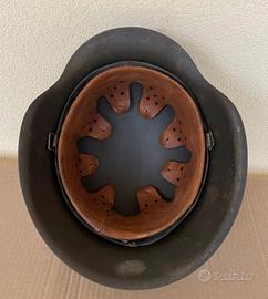 Elmetto tedesco m42. Liner in pelle nonoriginale, cerchione e rivetti non so dirlo. Internamente presenta il timbro del fabbricante con anno 1942. Guardandolo bene si può facilmente notare la verniciatura di base color giallo fronte italiano, sormontato da qualche macchia di vernice di un altro strato di giallo. Altre foto disponibili.