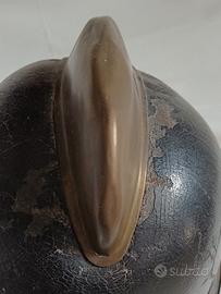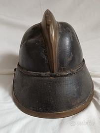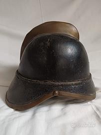Elmo da vigile del fuoco del XIX - XX. NON restaurato, in cuoio bollito con rinforzi, bordo e cresta in ottone. Mostra segni di invecchiamento e ossidazione sul metallo. Il casco è certamente originale, utilizzato da parecchi pompieri europei compresi gli italiani. Taglia unica perché era regolabile con la struttura proteggi nuca. Guardare attentamente le foto.