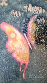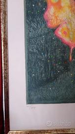 Soggetto giardino incantato con lucciole e farfalla. In cornice color argento screziato oro, con vetro sintetico, in ottimo stato di conservazione. Dimensioni: soggetto 43x60 cm, foglio 55x75, in cornice 59x80 cm.