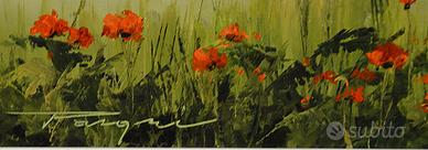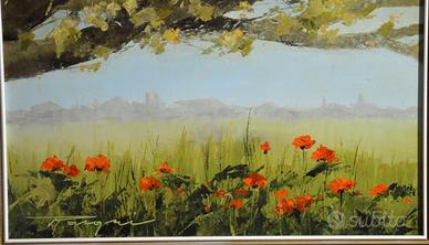 L’opera raffigura un suggestivo paesaggio primaverile: in primo piano un prato rigoglioso punteggiato da vivaci papaveri rossi, mentre sullo sfondo si intravede una linea di colline sfumate sotto un cielo limpido.