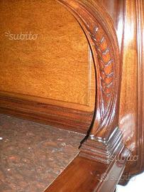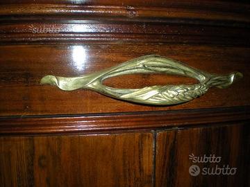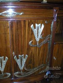 Importante buffet Majorelle in legno di mogano finemente intagliato con fregi e ferramenta/scultura in fusione a cera persa di bronzo dorato e piano in marmo, di evidente gusto Art Nouveau.