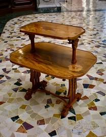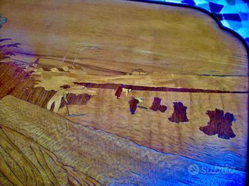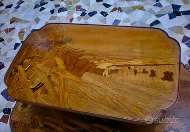 Tavolino da salotto firmato Gallè , in legno di noce biondo intagliato ed intarsiato con essenze diverse e tinte, di evidente gusto art nouveau.