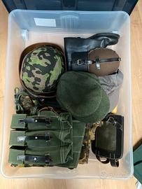 Equipaggiamento per uniforme replica waffen ss in mimetismo dot44, elmetto con copertura mimetica, stivali alti, cintura ufficiale waffen ss con fondina per P38 e berretti da campo