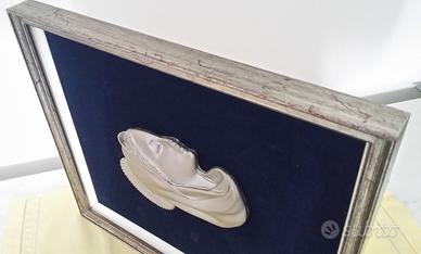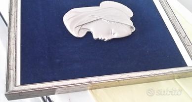 QUADRO A FIRMA EROS PELLINI (scultore milanese) - VISO DI MADONNA IN METALLO ARGENTATO SU SFONDO BLU stile velluto. Il tutto è incorniciato senza vetro di protezione. Visionare le fotografie inserite: il quadro misura in lunghezza 32 centimetri, e in larghezza 38 centimetri. L'opera proviene da una gallera d'arte della provincia milanese (nella foto dedicata sono stati nascosti i dati sensibili). La conservazione del quadro è ottima: non vi sono imperfezioni o segni di sorta che possano pregiudicare l'opera.