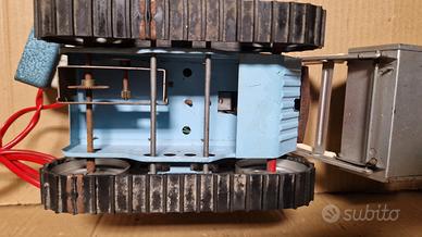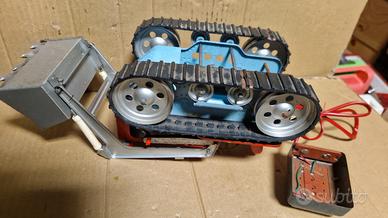 ESCAVATORE CINGOLATO Anni 70. prodotto dalla ditta Sommavilla di Mestre,ditta molto ricercata che produceva giocattoli in latta filoguidati vendo in modalità visto e piaciuto come da foto, lo vendo come non funzionante ,danneggiato ,in quanto mancano nella parte sottostante alcuni meccanismi che permettevano al giocattolo di alzare la benna e muoversi presenti alcune righe .Rimane un pezzo raro in quanto la Sommavilla non ha mai fatto grande produzione e vi sono pochi pezzi disponibili anche per pezzi di ricambio,esteticamente ben tenuto