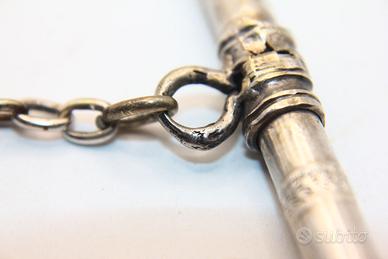 Immergiti nel fascino di un'epoca passata con questa esclusiva catena per orologio in argento, un autentico gioiello risalente al periodo di Napoleone III, circa 1850 Francia. Lunga 35 cm e dal peso di 23,1 grammi, la catena cattura lo sguardo con la sua raffinata struttura a tre fili. Due scorrevoli interni, finemente cesellati con maestria, misurano 20 x 12 mm e aggiungono un tocco di eleganza distintiva. L'autenticità di questo pezzo unico è suggellata da quattro punzoni d'epoca, testimoni silenziosi di una storia ricca di stile e artigianato.