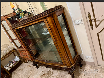 ESCLUSIVA e PREGIATA vetrina cristalleria STILE CHIPPENDALE, caratterizzata da elaborati intagli e ante scorrevoli in cristallo. Realizzata in radica di noce le ante in cristallo permettono una perfetta esposizione di oggetti d'arte, porcellane o collezioni. Antica risalente Primi 900. CONDIZIONI: ottimo stato conservativo ma essendo un articolo ANTICO/VINTAGE può presentare alcuni segni di normali usure e difetti commensurati all'epoca e all'uso nel tempo, da collezione.