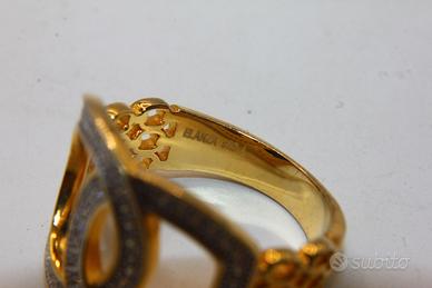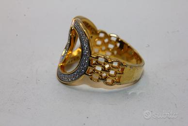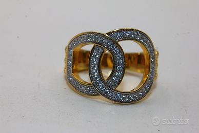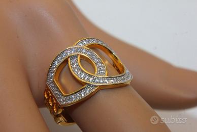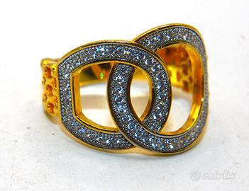 Esclusivo anello realizzato in oro su argento, caratterizzato da un design audace e contemporaneo. L'anello presenta una fascia ampia e imponente con due elementi ovali intrecciati sulla parte superiore. Questi elementi sono interamente tempestati da un pavé di scintillanti pietre di Zirconia Cubica (CZ), che conferiscono al gioiello una luminosità eccezionale. Il contrasto tra il metallo dorato e la brillantezza delle pietre bianche crea un effetto visivo di grande impatto. La misura interna del dito è di 17 mm.