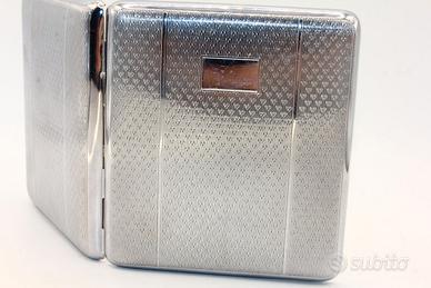 Raffinato astuccio portasigarette d'epoca di manifattura inglese, un pezzo da collezione che coniuga l'eleganza del design d'Oltremanica con una funzionalità senza tempo. Realizzato in EPNS (Electroplated Nickel Silver), l'esterno presenta una lavorazione finemente incisa con un motivo geometrico a trama fitta che crea suggestivi giochi di luce sulla superficie argentata.