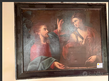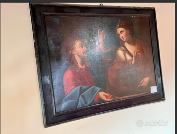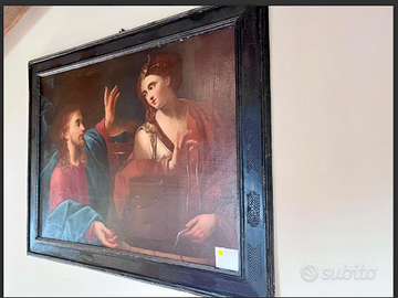 ESCLUSIVA e UNICA opera d'arte dipinto olio su tela raffigurante la scena biblica di "CRISTO e la SAMARITANA". Antico riconducibile al '600. CONDIZIONI: ottimo stato conservativo ma essendo un articolo antico/vintage può presentare i lievi segni del tempo che ne attestano l'originalità e il fascino. Proveniente da collezione privata Villa Veneta del '900. MISURE: L145xh115cm c.a. VISIBILE e RITIRABILE zona Treviso. STORIA: Quest'opera rappresenta una scena biblica molto popolare nell'arte religiosa del XVII e XVIII secolo Gesù nel Giardino del Getsemani, sostenuto da una samaritana durane l'agonia prima della crocifissione. Il tema era particolarmente diffuso nella pittura italiana e francese del periodo barocco, quando gli artisti cercavano di rappresentare momenti di intensa emozione spirituale con drammaticità e pathos. Dipinti di questo genere erano spesso commissionati per chiese, cappelle private o collezioni religiose.