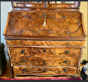 ESCLUSIVA e RARISSIMA VETRINA/TRUMEAU, un mobile antico a doppio corpo, VENEZIANO realizzato in legno di noce e radica con intarsi e specchi incisi. E' composto da un cassettone inferiore con cassetti sagomati e da un'alzata superiore con ante e specchio. La parte centrale presenta una ribalta che si apre per fungere da scrittoio. Antica risalente Fine 800 in stile Luigi XV.