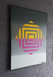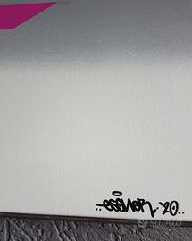 "Quadrato giallo con rosa" di Esone. Attivo come scrittore di graffiti dal 1985. L'artista Pedro Dentinho, meglio noto con il suo nome di graffiti Esone, ha fondato la fondazione Arnhem Art nel 2017. Questa fondazione offre agli artisti (di arte di strada) un palcoscenico e crea murales. Nei quasi 35 anni in cui l'artista ha lavorato con bombolette spray, ha sviluppato uno stile unico e astratto che ora mostra anche su tela. Vari tipi di bombolette spray e tappi sono stati usati per gli effetti speciali. Unendo sfumature di grigio e utilizzandolo come sfondo per la forma rettangolare, la tela assume un aspetto positivo e calmo. Indipendentemente da dove è appeso il dipinto, l'atmosfera della stanza cambierà in modo positivo!