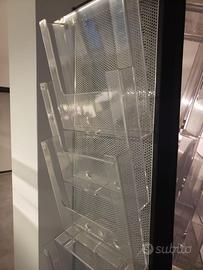 Espositore cataloghi/riviste/depliant in buone condizioni a tre facce. Base solida in metallo con porta cataloghi in plastica trasparente.