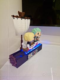 Sono inclusi i seguenti particolari: - Bandiera con rilievo - Albero maestro dettagliato - Timone anteriore - Scritta One Piece Non incluso: - LED blu ma acquistabile per 6 euro aggiungivi. Il LED è estraibile e sostituibile grazie ad un sistema da me progettato. Nei 6 euro è incluso l'alimentatore a 220V per il led con l'ON-OFF - personaggi PREZZO ASSOLUTAMENTE NON TRATTABILE