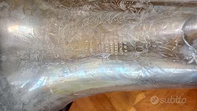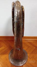 Raro eufonio antico originale Boosey & Co., marchiato 295 Regent St. London con numero di serie 54562, databile tra il 1899 e il 1900. Realizzato in ottone argentato con ricche incisioni floreali. Strumento storico di fascia militare britannica, con grande valore collezionistico.