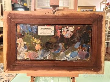 Eugenio Cecconi Campagna toscana Olio su tavola 20 x 40 cm Firma in basso a destra La composizione è costruita su una linea d’orizzonte bassa, che lascia ampio respiro al cielo, reso con una stesura leggera e vibrante, attraversata da sottili variazioni tonali. In primo piano si sviluppa una fascia di vegetazione spontanea, trattata con tocchi rapidi e materici, che introduce alla zona centrale dominata da un corso d’acqua o terreno chiaro, probabilmente un alveo o strada bianca. Sul fondo si susseguono campi e lievi rilievi, scanditi da macchie verdi e brune, con presenze arboree isolate che ritmano la profondità. La tavolozza è tipica: terre calde, verdi naturali e cieli attenuati, con un uso della luce che suggerisce un momento quieto, forse pomeridiano. La pennellata è sintetica e immediata, coerente con la ricerca macchiaiola: costruzione per masse cromatiche più che per dettaglio descrittivo. L’insieme restituisce un’impressione veritiera e atmosferica del paesaggio, con un equilibrio tra osservazione dal vero e sintesi pittorica.