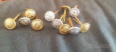 Antichi bottoncini F.S. in metallo dorato e/o argentato con in rilievo la ruota alata, primo simbolo delle Ferrovie dello Stato. Sono originali dell'epoca. Il simbolo è costituito da una ruota di locomotiva alata. Sul retro 2 alette in metallo che ripiegate si fissavano sul sottogola del berretto di servizio. Vendo in coppia, indifferentemente argentati o dorati al costo di 2 euro a coppia ma se ne comprate almeno 10 coppie il prezzo sarà di 15 euro anziché 20. In vendita anche ex fregi delle F.S. originali. Posso spedire con posta 1 al costo di 3 euro. Accetto tutti i tipi di pagamento tranne il contrassegno. Non ho PayPal.